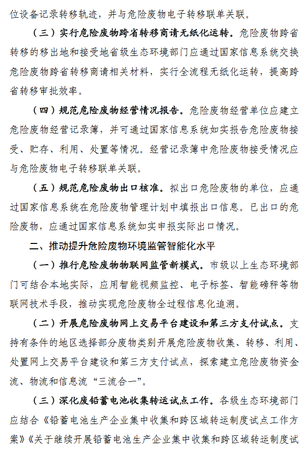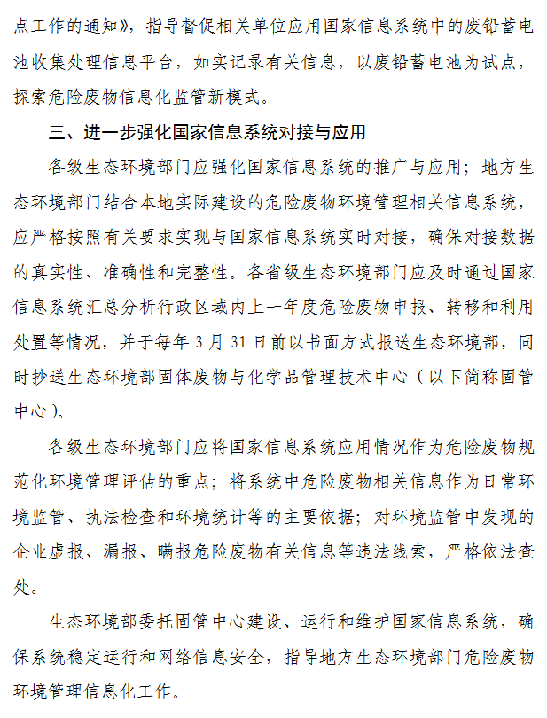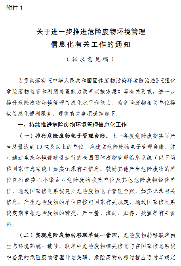 为贯彻落实《中华人民共和国固体废物污染环境防治法》《强化危险废物监管和利用处置能力改革实施方案》等有关要求,进一步提升危险废物环境管理信息化水平和能力,为危险废物相关单位提供信息化便利服务,生态环境部办公厅研究起草了《关于进一步推进危险废物环境管理信息化有关工作的通知(征求意见稿)》。让我们来看一下有哪些内容吧。